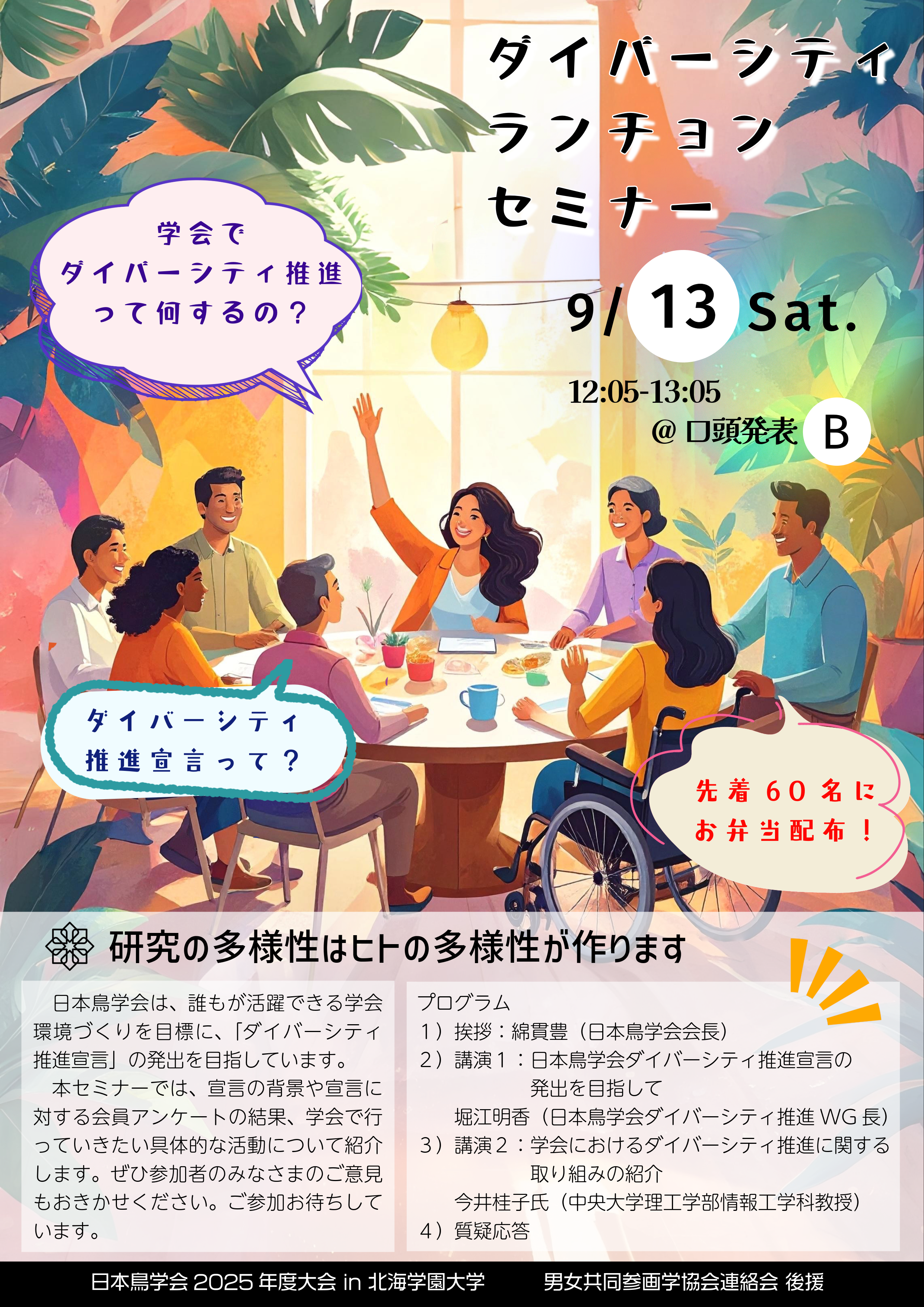 日本鳥学会ダイバーシティ推進ワーキンググループでは、「研究の多様性はヒトの多様性が作ります」をコンセプトに、さまざまな属性の学会員すべてが能力を発揮できる学会環境の整備を目指して活動を行っています。今年度大会でも、以下の通り、研究とダイバーシティに関するランチョンセミナーを開催します。セミナー中に会場で食事が可能ですので、昼食を食べながら、ぜひご参加ください。先着60名様に無料でお弁当を配布します。